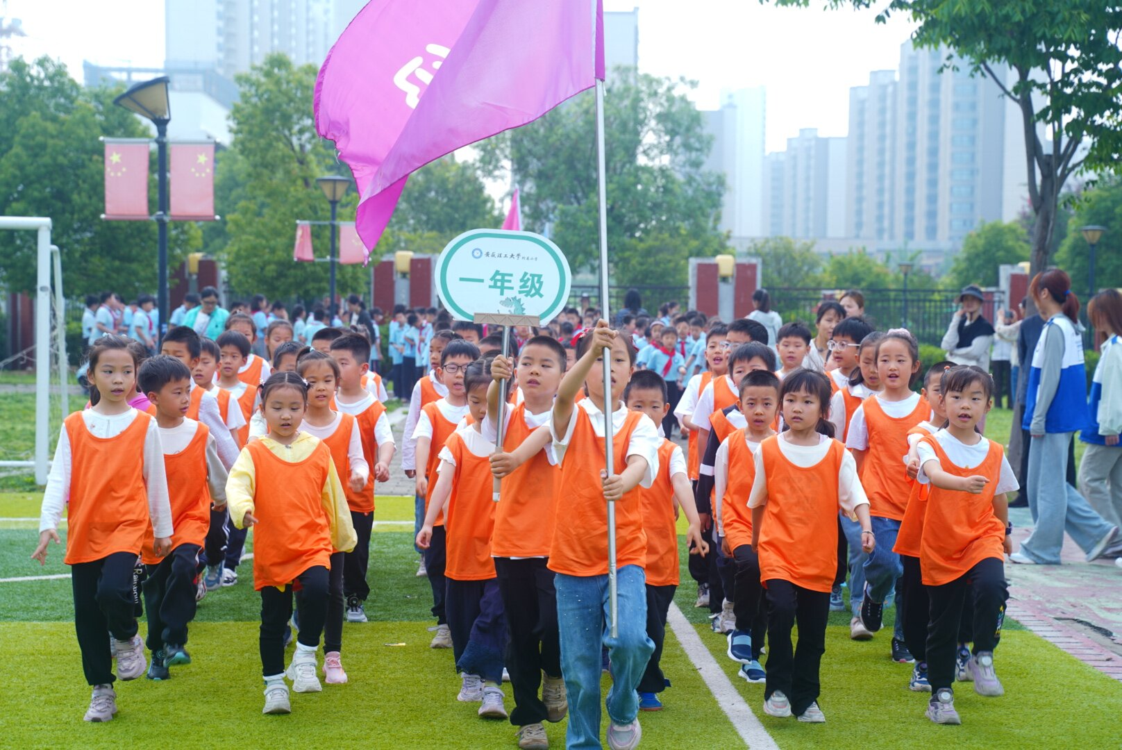 开幕式上,各班运动员和大学生志愿者组成的彩旗方阵,迈着整齐的步伐陆续进入运动场。“齐步走,一二一!”伴随着运动员进行曲,各班级方阵闪亮登场!一二年级“小萌娃”青涩懵懂萌翻全场,三四年级“生力军”意气风发摩拳擦掌,五六年级“先锋队”英姿飒爽志在必得……每个年级都用独特气场诠释运动精神,为赛场注入无限活力!