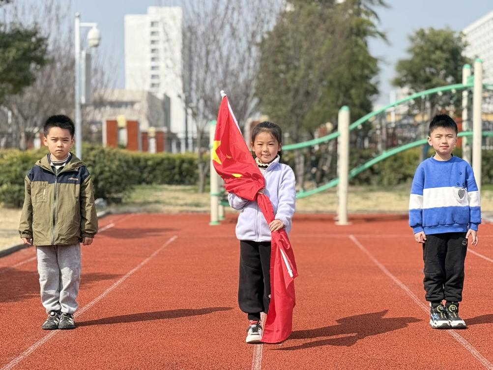 担任本次升旗仪式的小旗手们,迈着稚嫩却坚定的步伐护送国旗走向升旗台。当激昂的国歌声响起,全场师生庄严肃立,行注目礼,鲜艳的五星红旗缓缓上升。