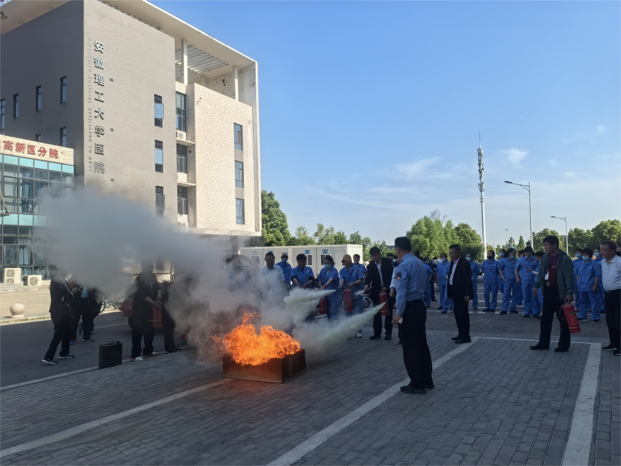 培训结束,彭广峰在平苑食堂楼下广场向参会人员演示了灭火器的使用方法,并现场分批指导进行了灭火演习。