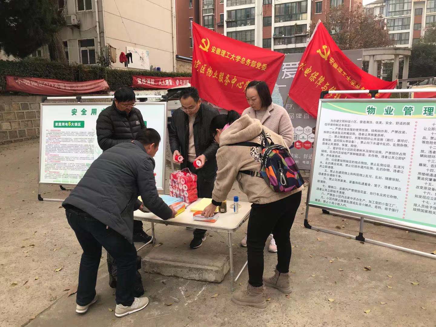 12月11日下午,按照总务部党委“建堡垒、创特色、增活力”的要求,水电与修缮、住宅区物业中心党支部组织在职党员走进宜园、校本部、北校区等家属区,开展冬季水电安全和物业管理规定等宣传活动。