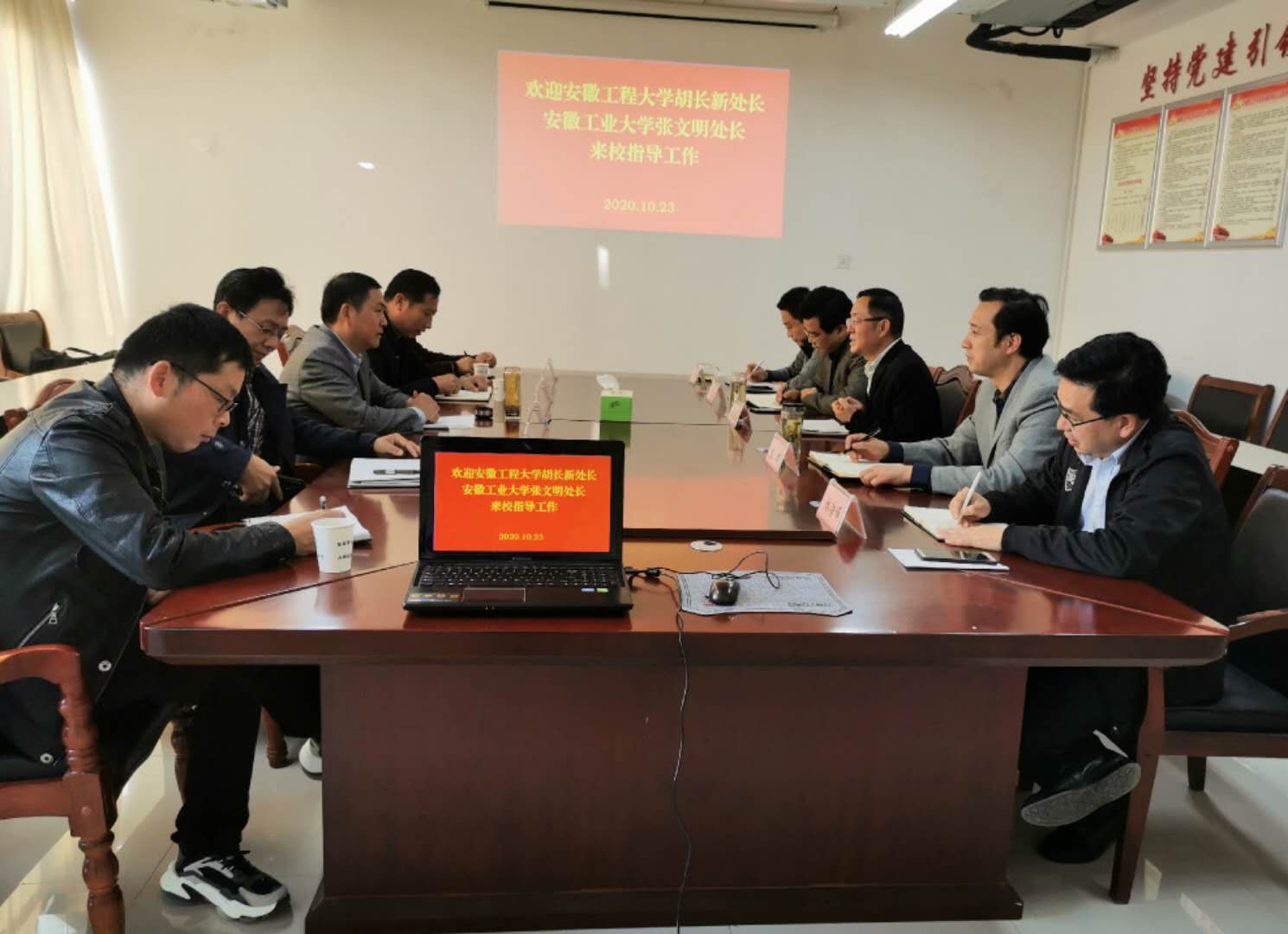 10月23日下午,安徽工程大学后勤保障处(后勤集团)处长(总经理)胡长新一行4人和安徽工业大学后勤处(后勤集团)党委书记、处长(总经理)张文明来校交流后勤服务与保障工作。总务部党委书记谢中根、部长洪江如及相关部领导在舜耕楼527会议室热情接待了胡长新、张文明一行。
