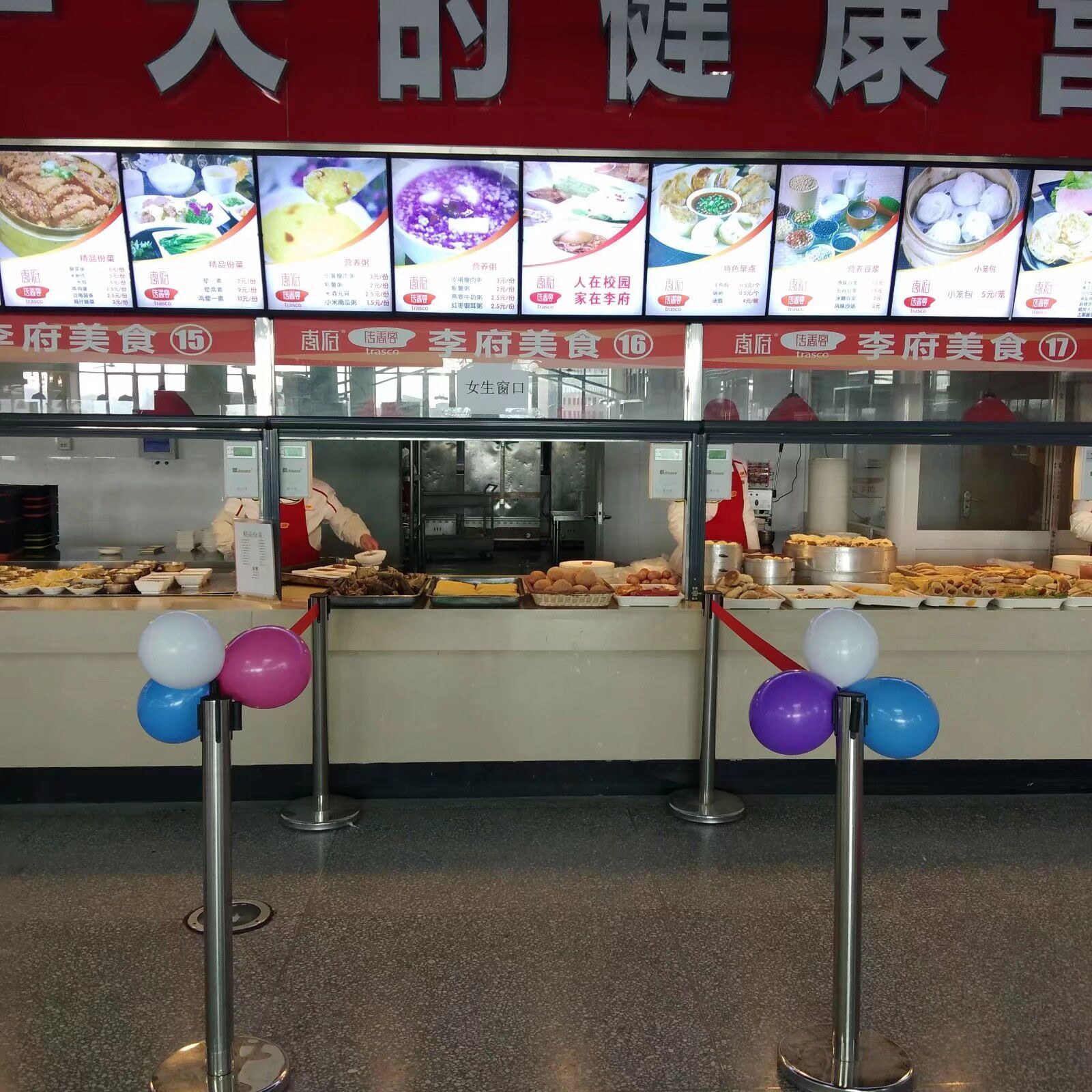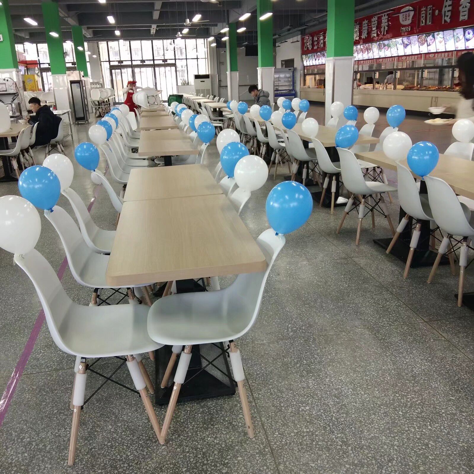 爱苑食堂的以二楼为主,特色布置了特色装扮,营造了温馨的活动氛围。现场在各个饭菜窗口以及每个座位上以各色气球装饰,为女生设置了就餐专用区域,同时发售特色菜品。