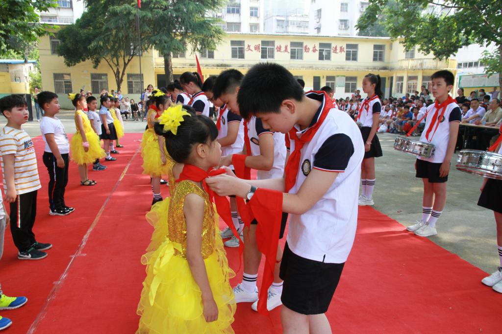 伴随着节奏鲜明的出旗曲,一年级的小学生在领导、老师和家长们的见证下,佩戴上了鲜艳的红领巾,在队旗下庄严宣誓,加入了中国少年先锋队组织,成为光荣的少先队员。随后,舞蹈《加油,amigo》拉开了文艺汇演的序幕,舞蹈节目精彩纷呈,小学生们在舞台上个个神采飞扬,尽情展现着童真与梦想,感受着快乐与自信。观看演出的家长们随着节拍喝彩,台上台下沉浸在一片欢乐的海洋中,共同分享了一场快乐纯真的童年盛宴。