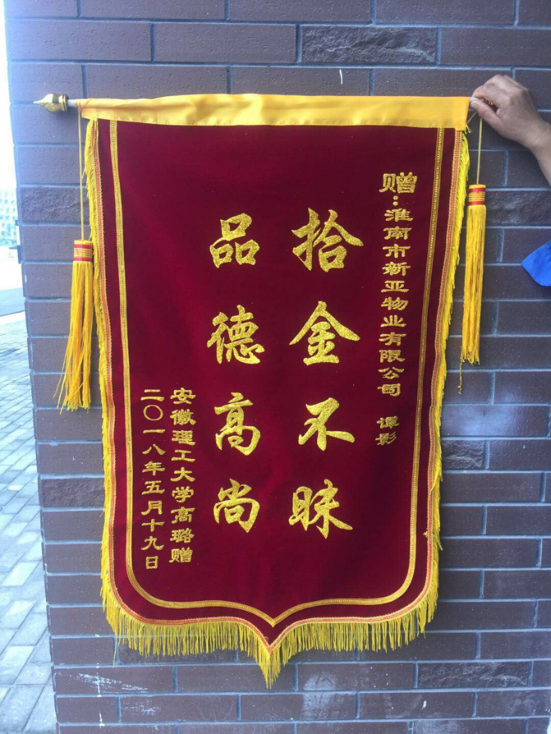 “这块锦旗请您一定收下,这只是我的一点心意。非常感谢您,是您让我的手表失而复得,您的拾金不昧的高尚品德值得我们学习,我为您、新亚物业和后勤保障部门的服务管理点赞。”5月21日,同学高璐拉着承担校园保洁服务的安徽新亚物业公司员工谭影的手,满怀感激地说道。