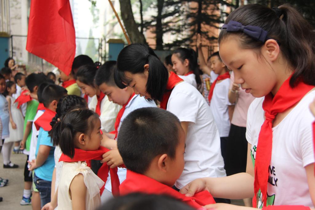 高年级少先队员为新入队学生佩戴红领巾