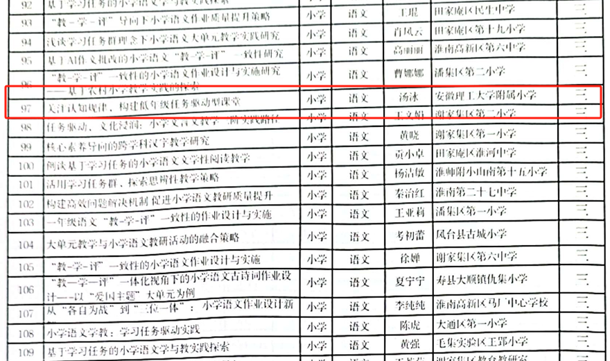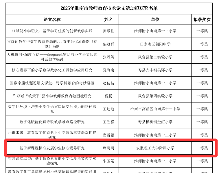 在市级论文评选中,两位教师表现亮眼。席明明老师在2025年淮南市教师教育技术论文活动中,斩获市级一等奖;汤泳老师则在淮南市2025年中小学教育教学论文暨大中小学思政课一体化建设专题论文评选活动中,荣获市级三等奖。