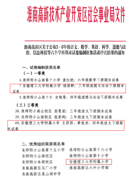 在淮南市高新区组织的试卷编制活动中,附属小学教师凭借扎实的专业功底斩获一等奖、三等奖各一项,附属小学亦荣获优秀组织奖。